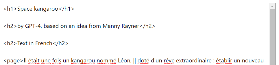 Here is an example, “Space kangaroo”, that I just posted. I manually added a title page in the ‘Segmented Text’ view, the top of which now looks like this: