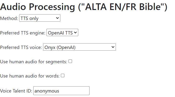 In her post two days ago, Cathy rightly said that the free Google TTS voice, which we’ve previously been using as our default, is not very good. I am in the middle of experimenting with connecting up various pieces of OpenAI software to C-LARA, so I thought I would make their TTS engine available too. You can now use it if you go to the ‘Audio Processing’ view (this was previously called ‘Human Audio Processing’) and select OpenAI and a voice. The one I like best is ‘Onyx’:
