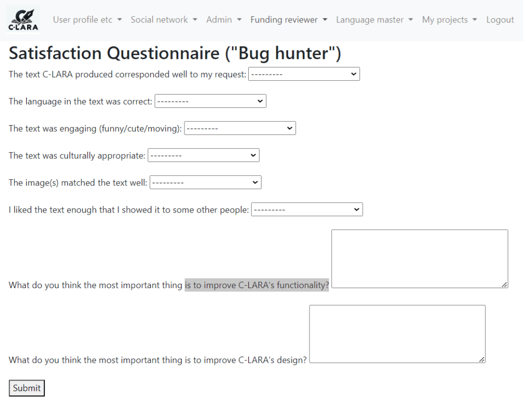 I have implemented the idea Branislav suggested a few weeks ago of adding satisfaction questionnaires. These are presented at the end of both full C-LARA and simple C-LARA. A questionnaire screen looks like this: