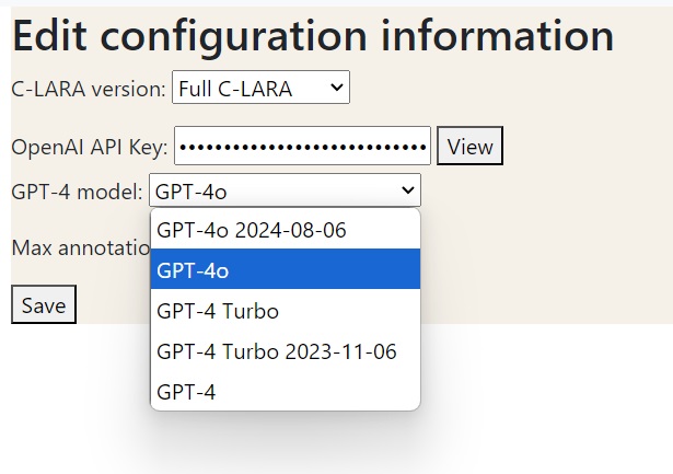 OpenAI released a new version of GPT-4o last month, the catchily titled gpt-4o-2024-08-06; it is considerably cheaper to use than standard GPT-4o., details here. I have just updated the C-LARA configuration menu to make it available and also set GPT-4o as the default model.