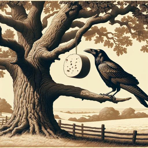 The size and position of the cheese do not match the specification; the description mentions it suspended from a branch rather than in the raven's beak. Additionally, the raven is described as large, contrasting with the specified medium size. Overall, the details are mostly consistent, capturing the style and pastoral setting, but these discrepancies are noteworthy.