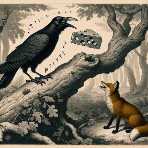 - Text appears near the raven’s beak, suggesting the action of it speaking or the cheese falling.