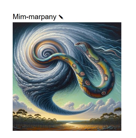 Draft page from the Kok Kaper picture dictionary. The word mim-marpany can mean either “cyclone” or “rainbow snake”.