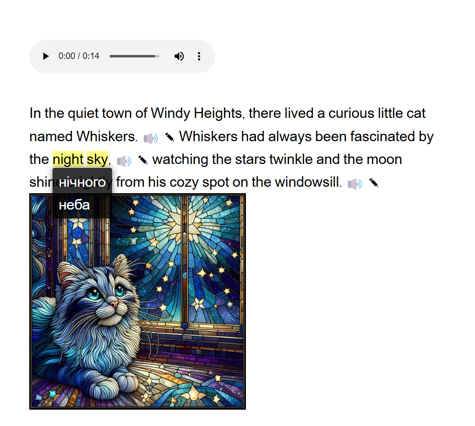 Draft page from the Ukrainian-glossed version of The Cat and the Bat, a children’s story written by C-LARA. Illustrations were created in a style intended to look like stained glass windows.